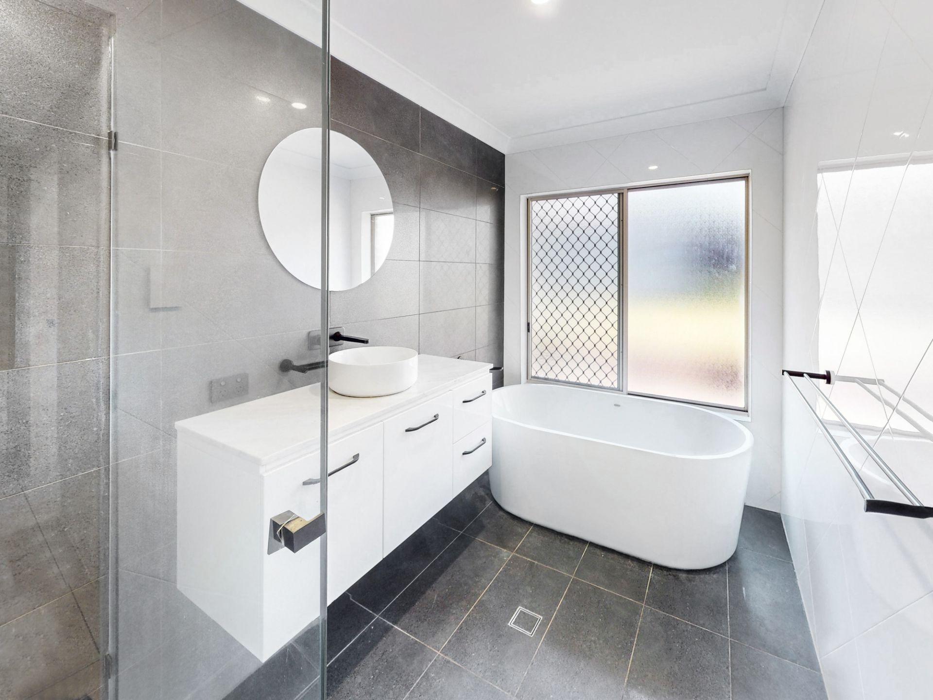 • Main bathroom boasts a free standing bath tub, frame less shower, modern vanity & black fittings with a separate toilet.