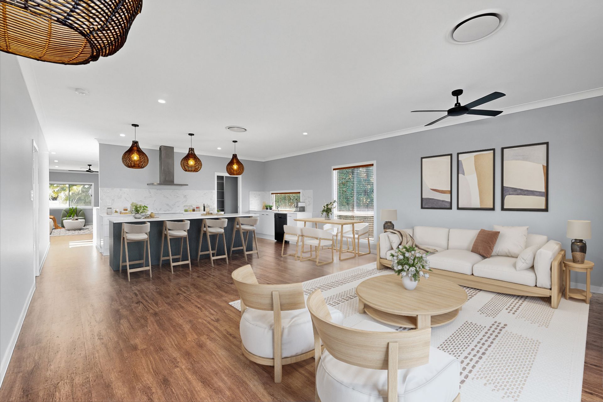 - Open-plan living and dining area filled with natural light