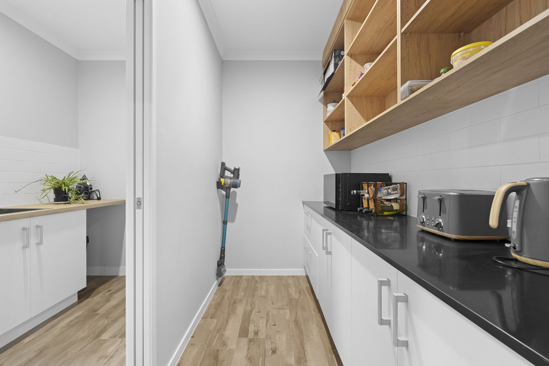- Contemporary kitchen with stone benchtops, stainless-steel appliances, and a generous butler's pantry