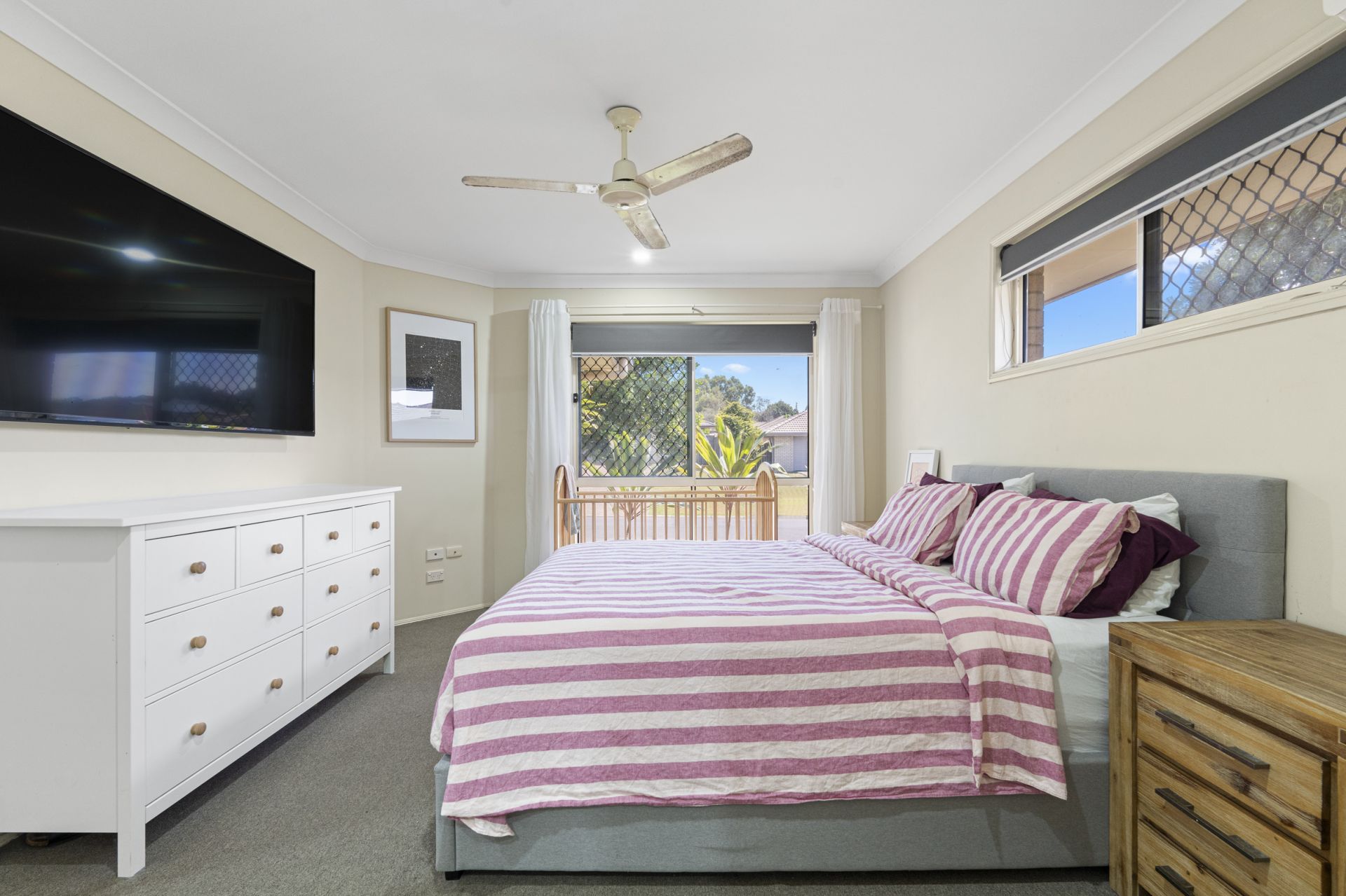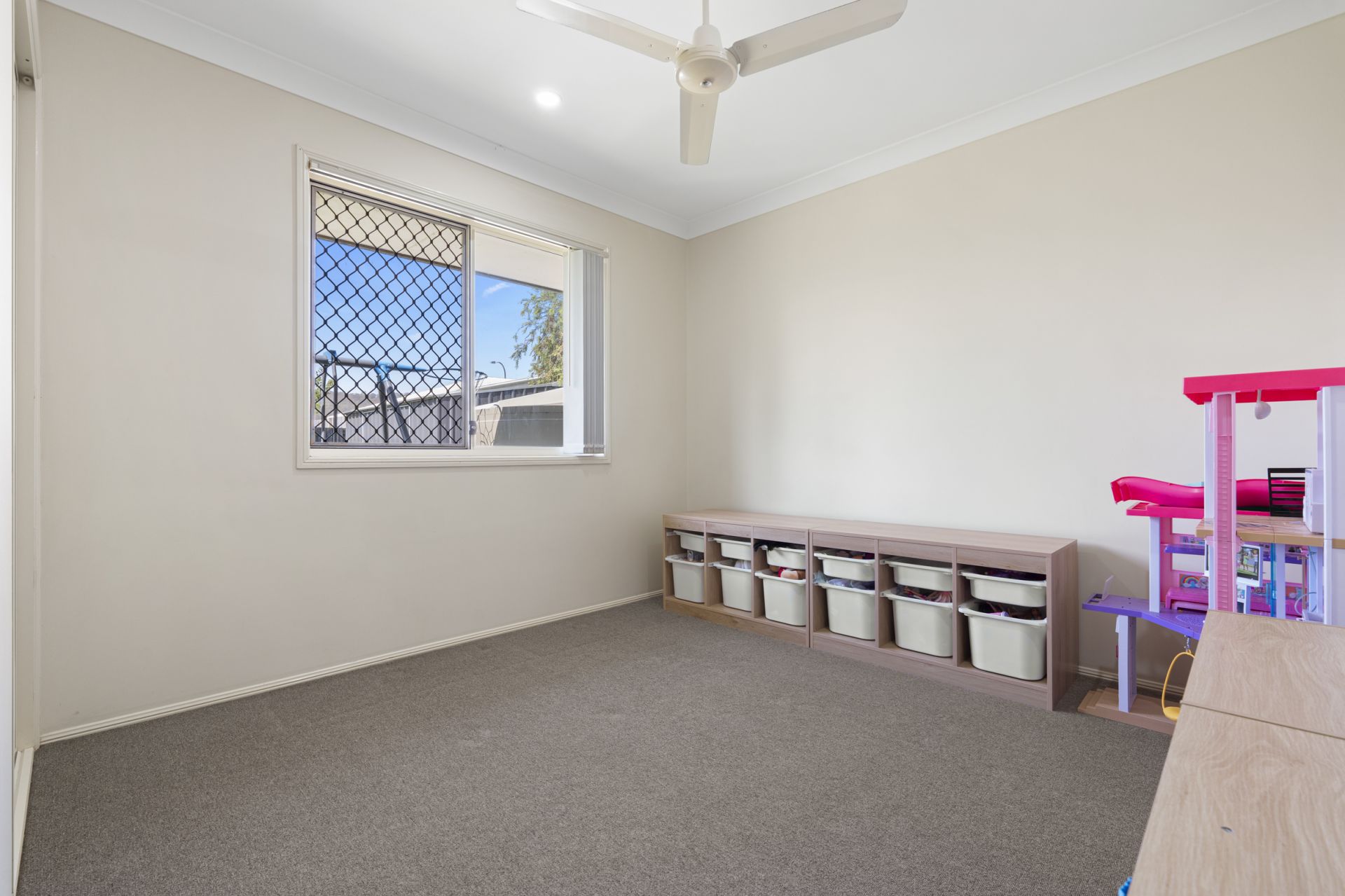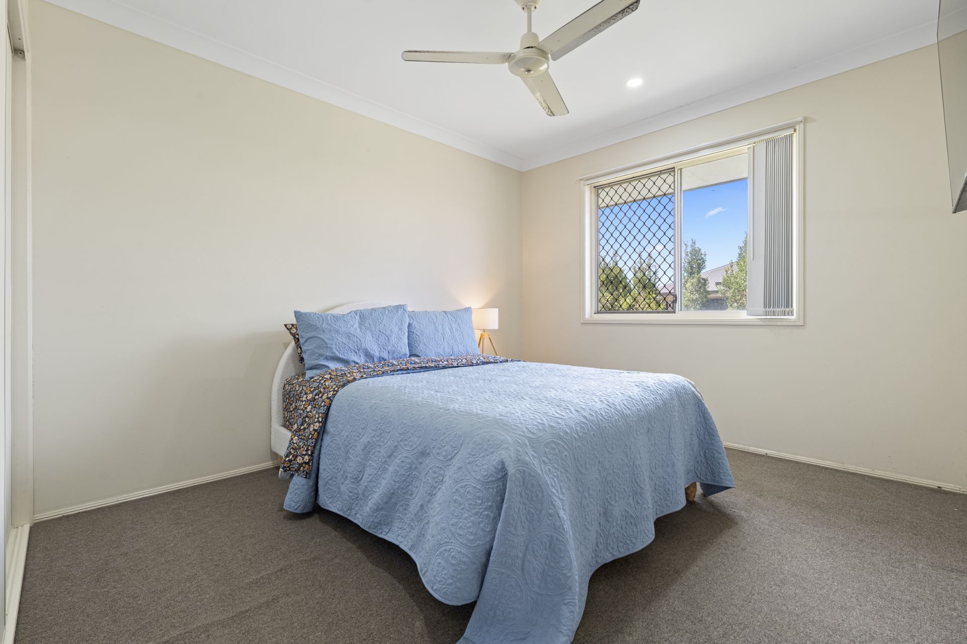 All four bedrooms have ceiling fans and built-in robes, the second bedroom has air conditioning, and master bedroom provides a quiet space to retreat to at the end of a long day with a view of the front yard, air conditioning, a walk-in robe, and a spacious private ensuite.