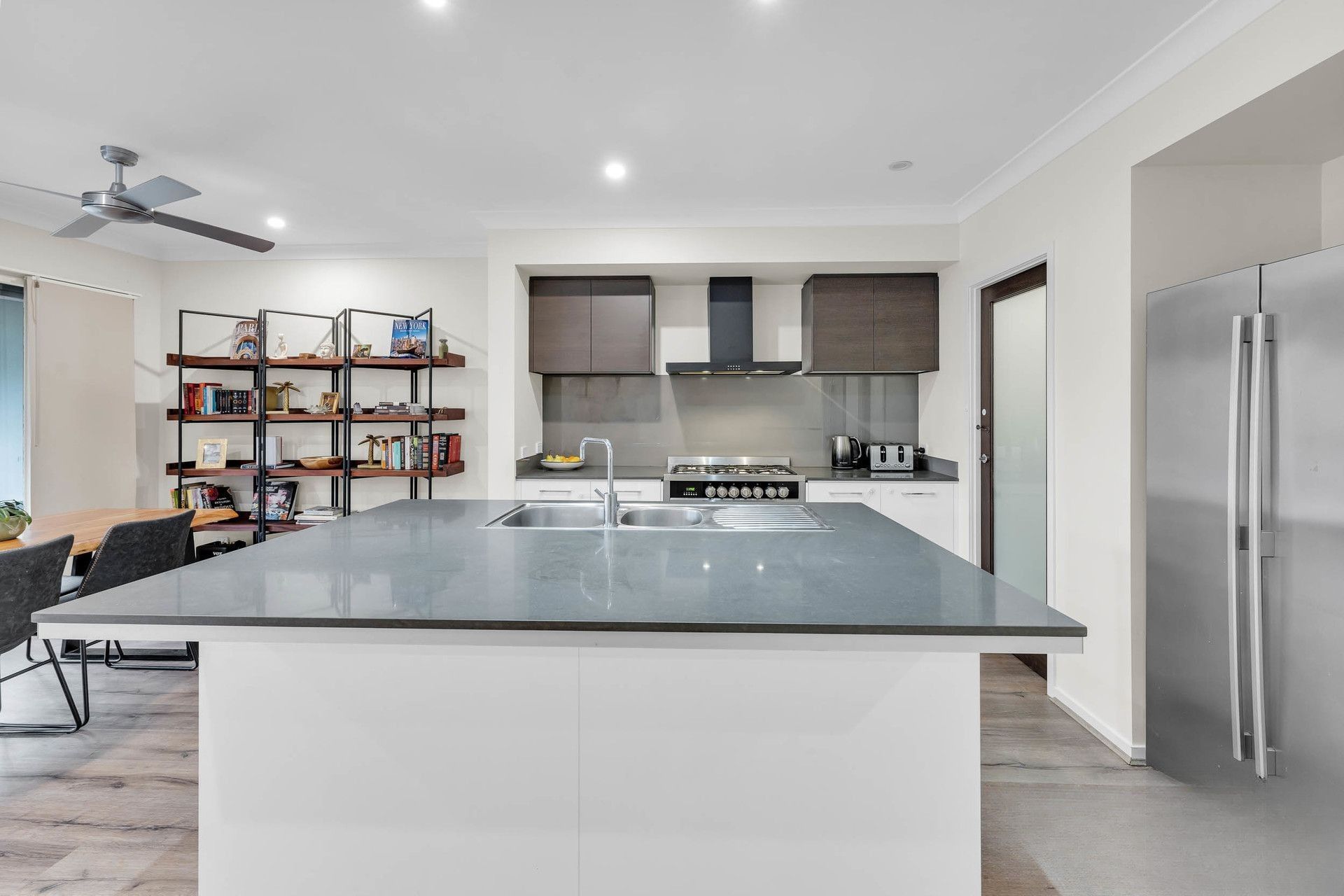 - Modern kitchen featuring quality stainless steel appliances, ample storage, and stone benchtops
