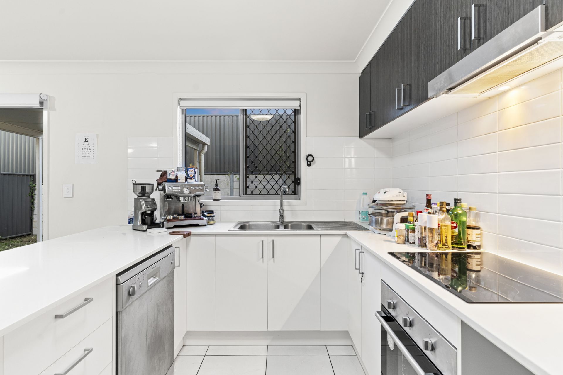 - Modern kitchen with stone benchtops, stainless steel appliances, and dishwasher