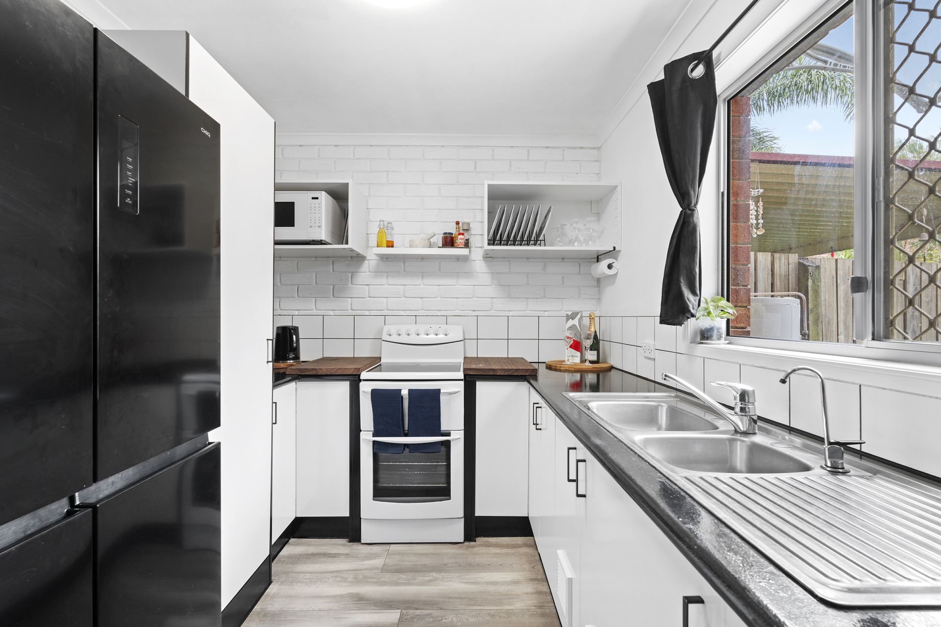 As you enter into the open plan living area, you will be welcomed in with beautiful near-new flooring and neutral tones offering a serene place to gather with family and friends. The kitchen has been renovated in a contemporary style with white cabinetry, open shelving, a dishwasher, chilled filtered water in the kitchen tap, and a view of the courtyard from the kitchen sink.