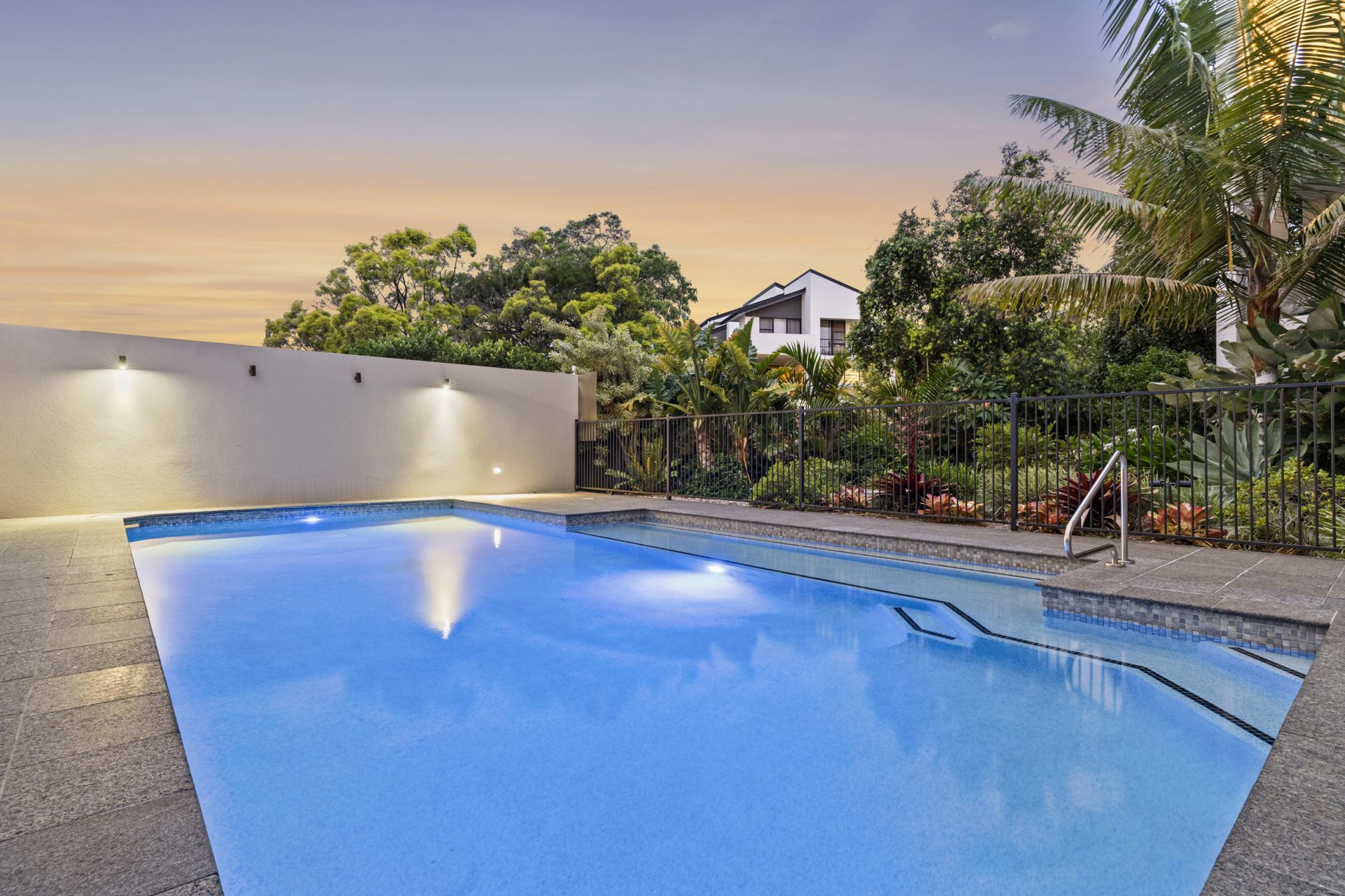 The balcony overlooks the sparkling swimming pool yet remains private—ideal for quiet mornings, relaxed evenings, or entertaining loved ones.