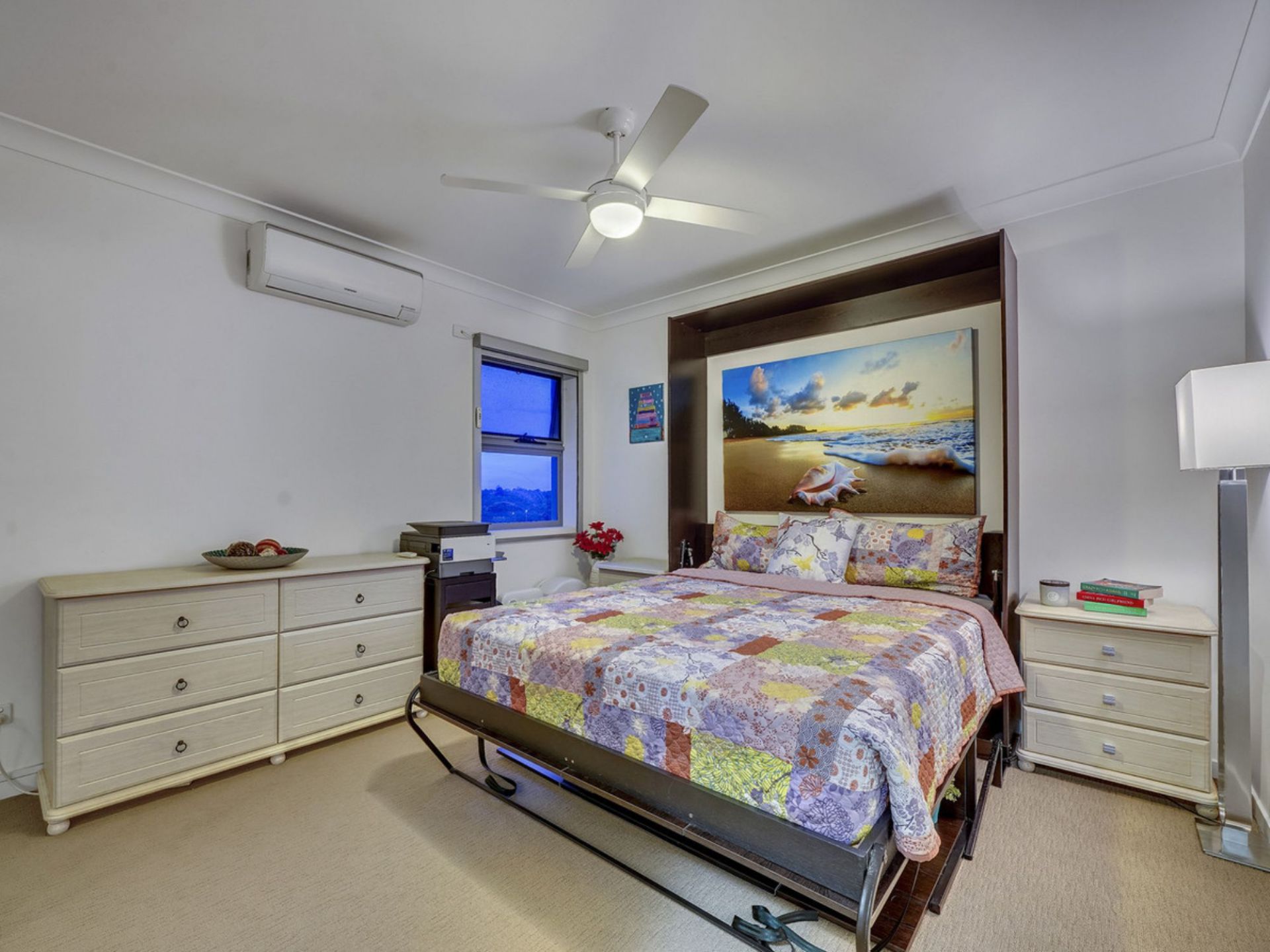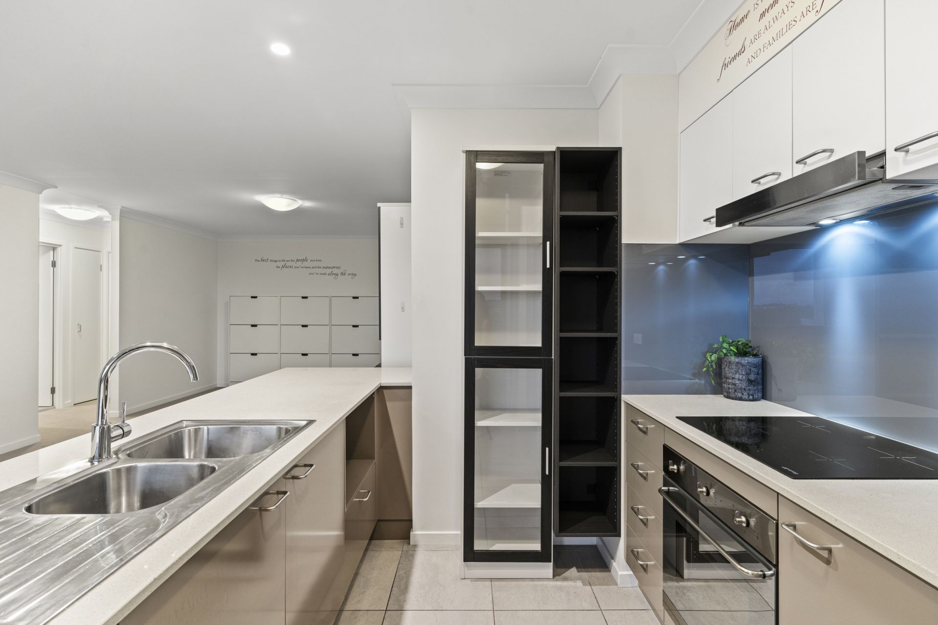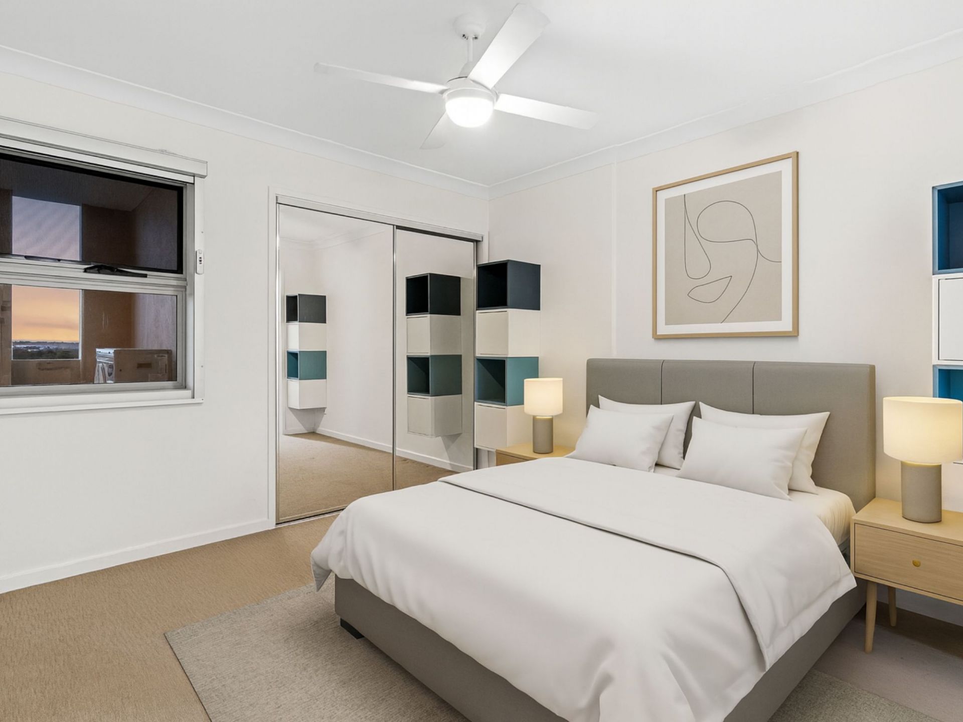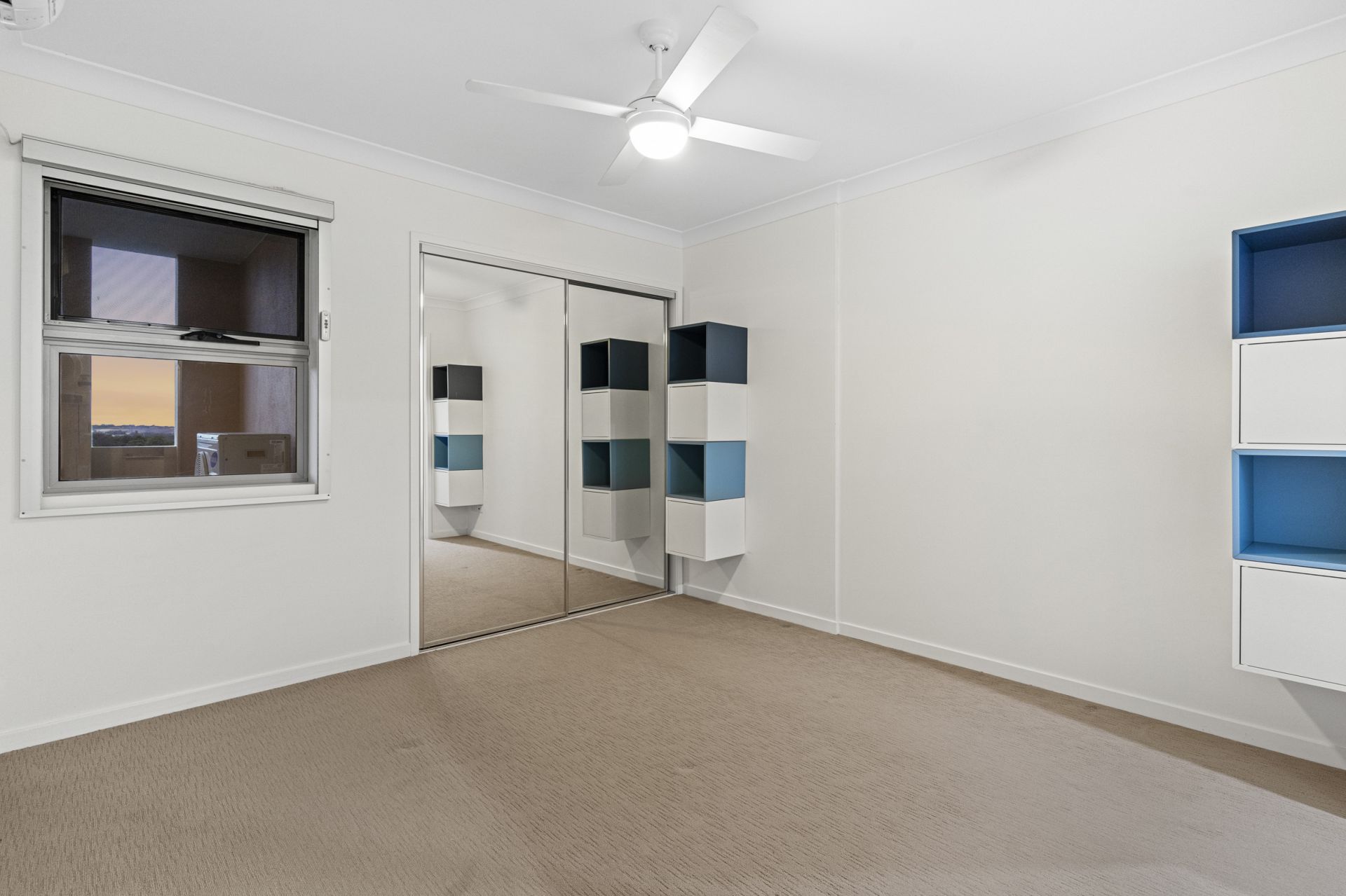 - Two generous bedrooms with built-in wardrobes, extra cabinetry & motorised block-out curtains