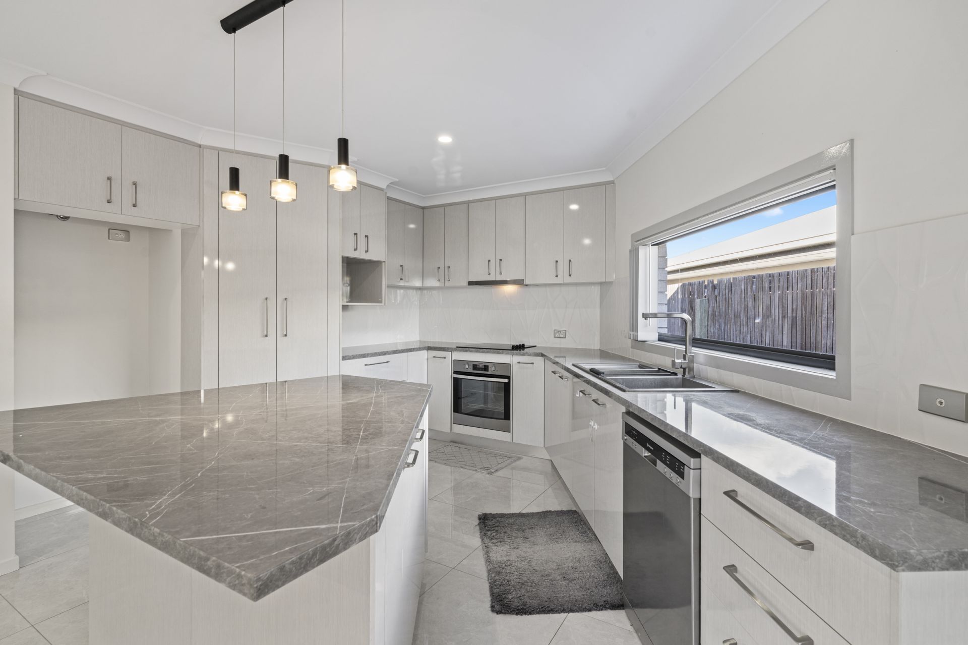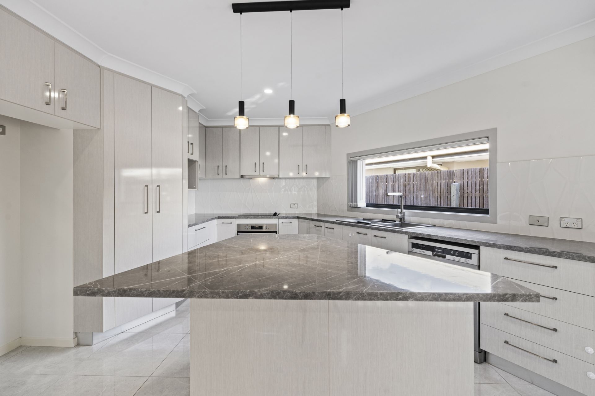 Step into the open plan living area where cool neutral tones, marble tile flooring, and modern finishes make the space fresh and inviting. The stunning kitchen is the heart of the home with pendant lighting, quality appliances, stone benchtops, ample bench space, and a large island with room for seating.